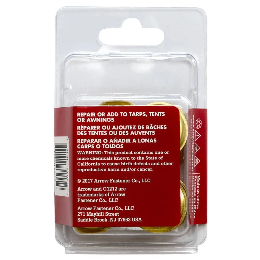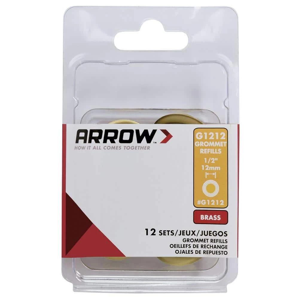 Arrow 1/2 in. (12 mm) Grommet refills are made of 100% brass to deliver exceptional holding power and rust resistance on all indoor and outdoor fabrics. Use them to repair or add to canvas, tarpaulins, tent awnings, sailcloth, tonneau covers, lawn furniture, pool covers or crafting material. Compatible with the Arrow Multi-Grommet Tool Kit (item# GK1238).