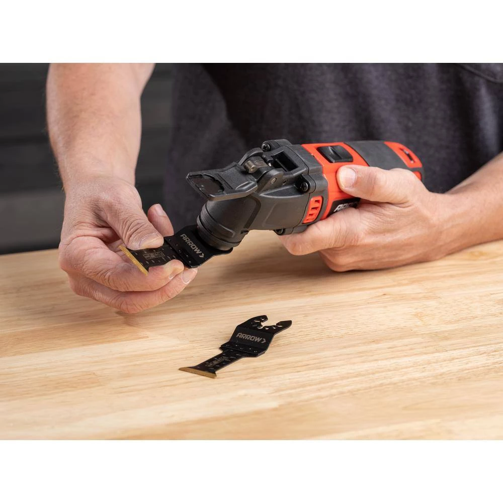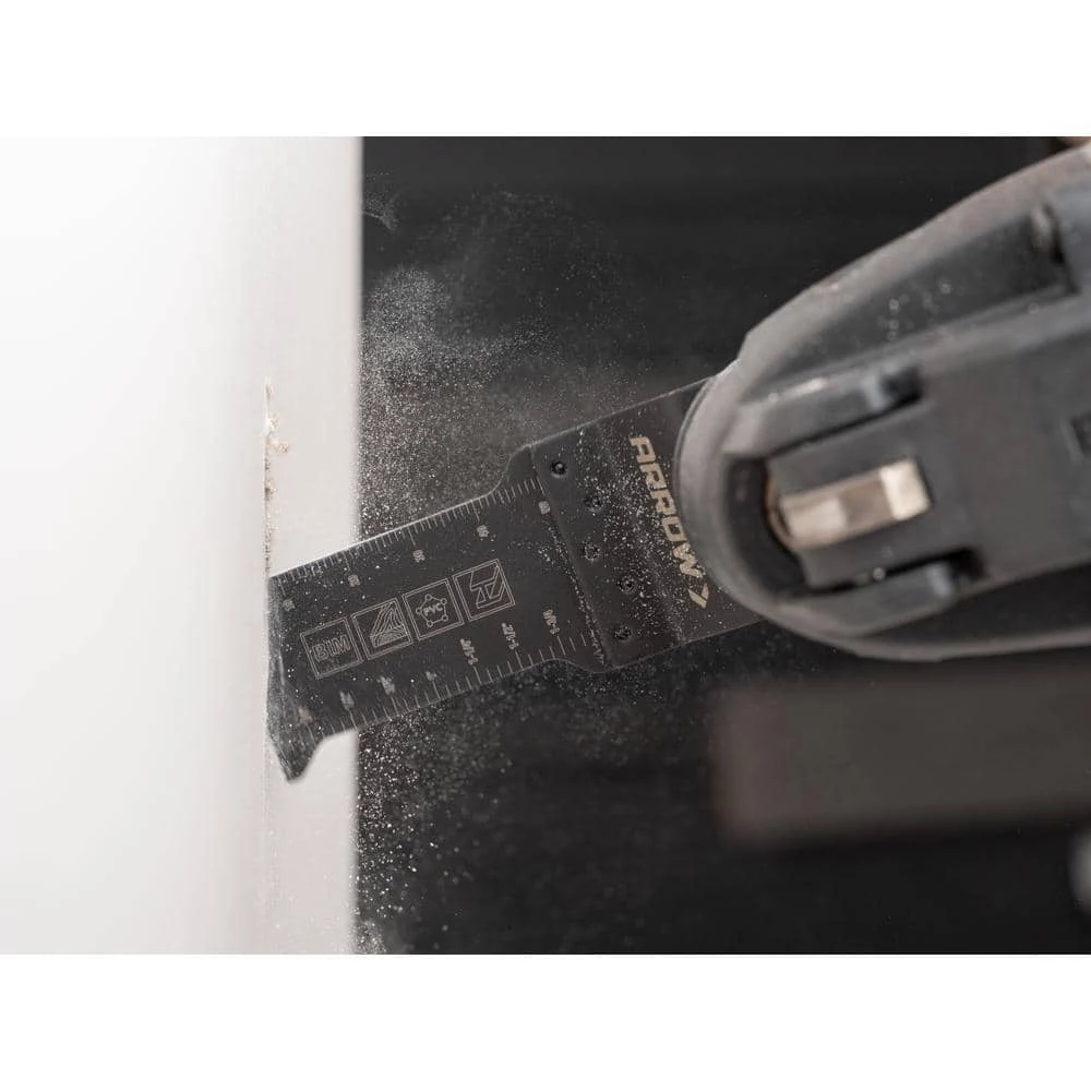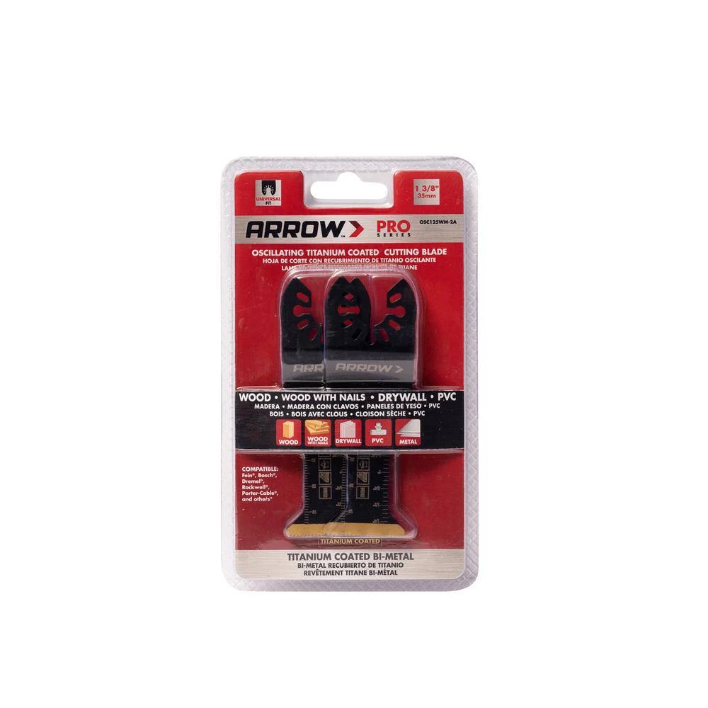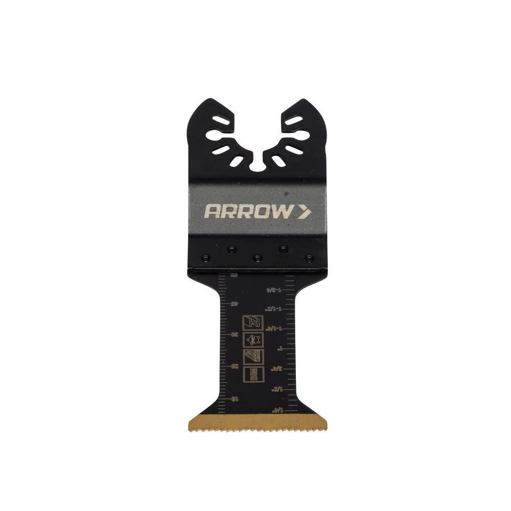 The Arrow Bi-Metal Oscillating Tool Blade features a 2-pack of 1-3/8 in. blades for convenient use to complete all your metal-cutting projects. The Arrow Titanium Coated Bi-Metal Oscillating Tool Blade are ideal for metal, wood with nails and more. These titanium-coated cutting blades have a universal-fit open-back connector for use on most major brands of oscillating tools. The Arrow Titanium Coated Bi-Metal Oscillating Tool Blade features solid and durable bi-metal blades with titanium-nitride coating along the tooth strip to increase blade life by reducing heat and increasing hardness. The wide 1-3/8 in. blade easily removes material quickly and effectively. in addition, the impactful packaging on the Arrow Titanium Coated Bi-Metal Oscillating Tool Blade makes it simple to match the application for your next project.