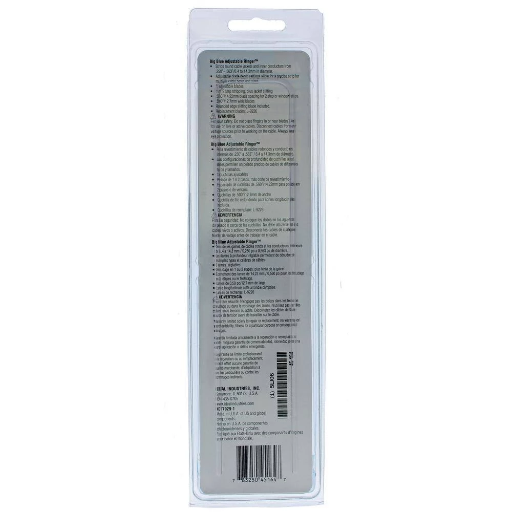 Big Blue Adjustable Ringer stripping tool allows for jacket and conductor stripping for many types of round cable, including multi-conductor fiber, coaxial, twisted pair and basic insulated conductors. This is a physically larger prep tool than the other Ringer tools. This version also works well for specialty cable preparation where traditional fixed blade stripping tools just don’t work as needed for the application. The 45-164 includes three larger 1/2 in. long separate active cutting blades which are all able to be adjusted to the proper cutting depth via a Phillips screw setting for each blade. Blades can be individually set to score the jacket so the inner conductors or shielding do not get damaged. The tool can be used for jacket stripping or scoring, including mid-span access stripping, 2-step conductor preparation by having the 0.560 in. spaced side blades cut to different depths one for jacket removal, the other for dielectric removal/conductor exposure. The front blade can be used to slit a jacket end or complete a mid-span cut.