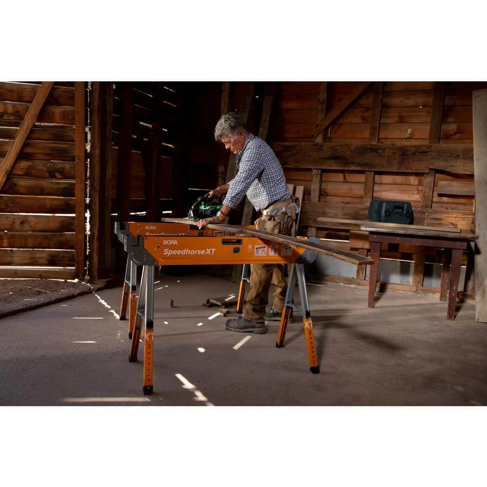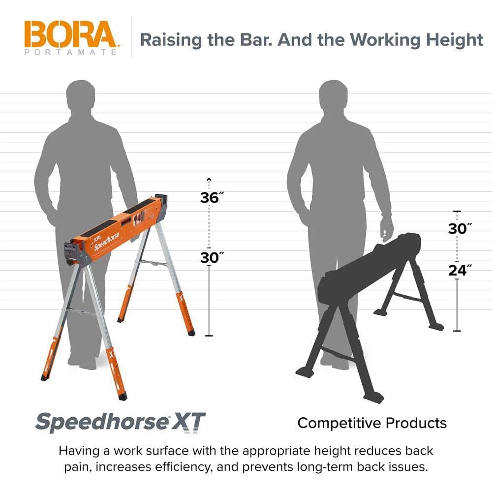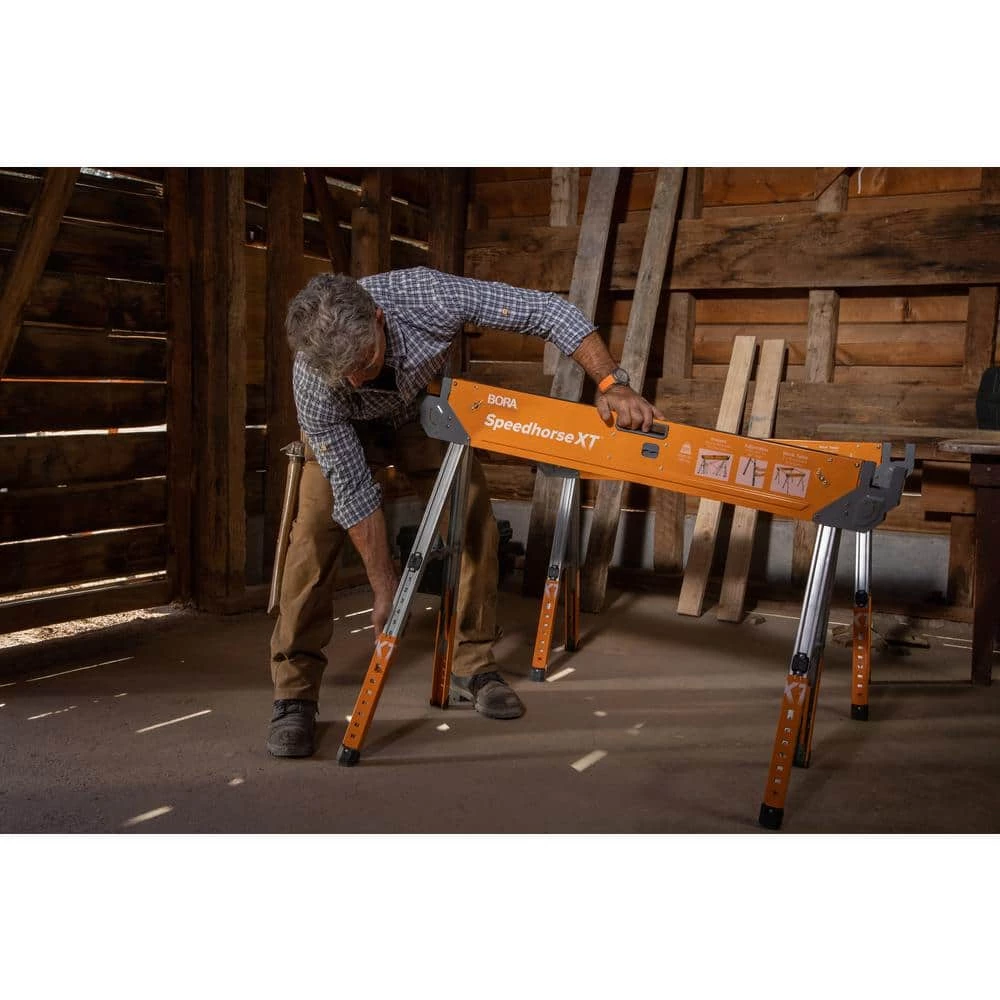 How do you upgrade the ultimate jobsite upgrade? Give it adjustable legs. We took our bestselling PM-4500 Speedhorse sawhorse and gave it individually extendable legs. The SpeedhorseXT is no ordinary sawhorse, it deploys 30x faster than conventional saw horses and can be adjusted from 30 to 36″! This means you can raise your SpeedhorseXT to the height you need to work efficiently and without pain. Each leg can be adjusted individually to compensated for un-even worksite terrain. The SpeehorseXT is the ultimate upgrade for your job site, workspace, garage, or workshop.