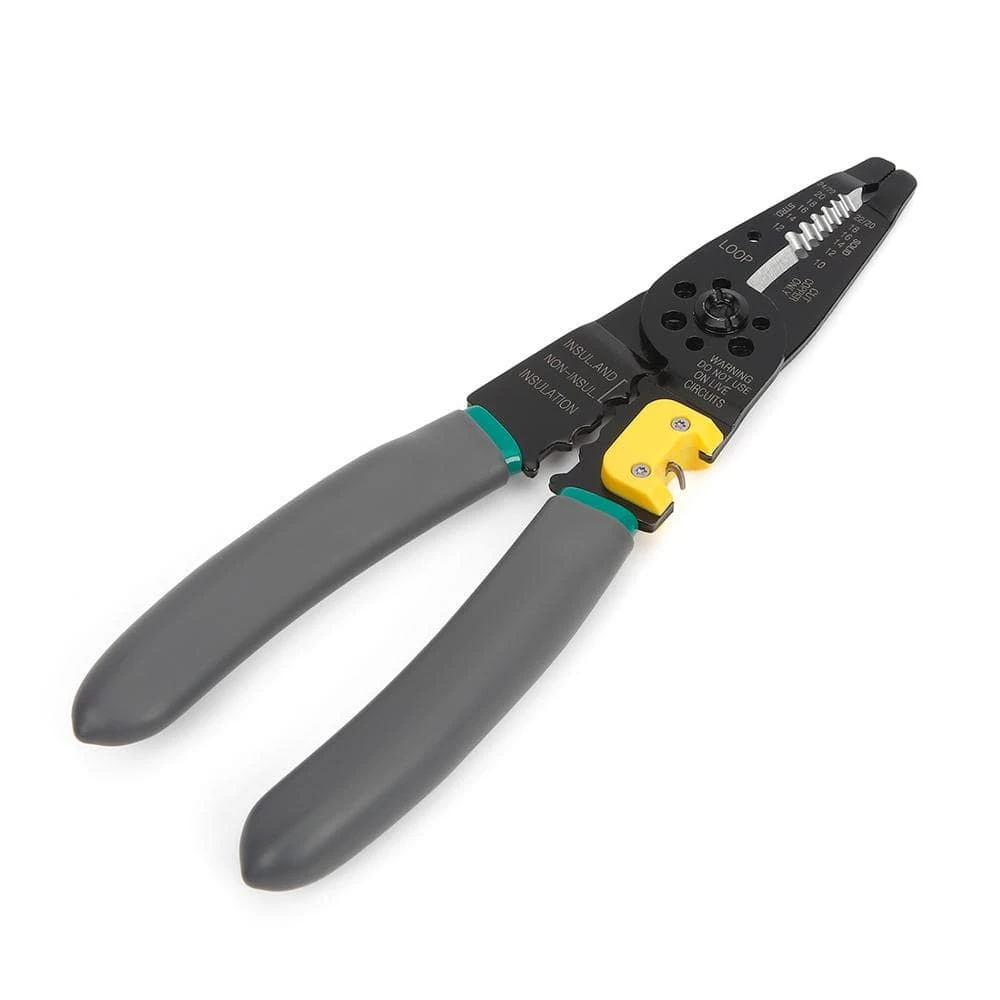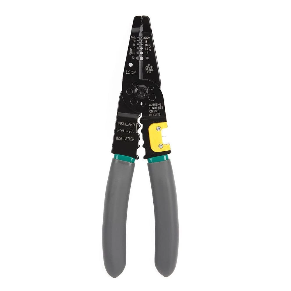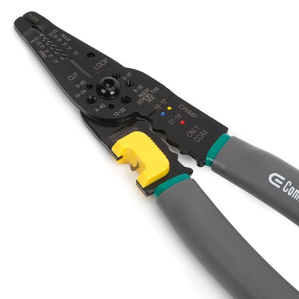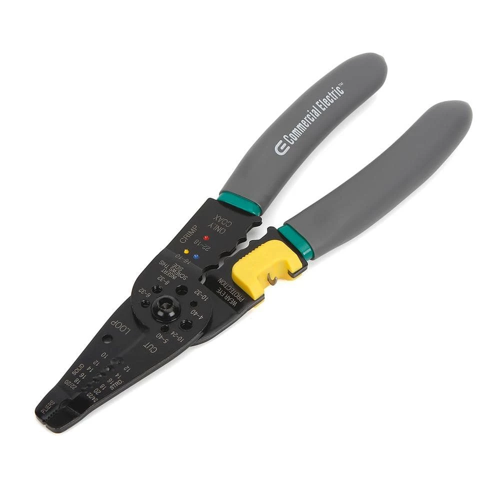The Commercial Electric 8 in Wire Stripper with NM Ripper performs many of the functions needed to complete electrical wiring tasks. This wiring tool has the ability to strip wire, cut and thread bolts, and crimp terminals. Designed to be used on 10-22 AWG solid and 12-24 AWG stranded wire.