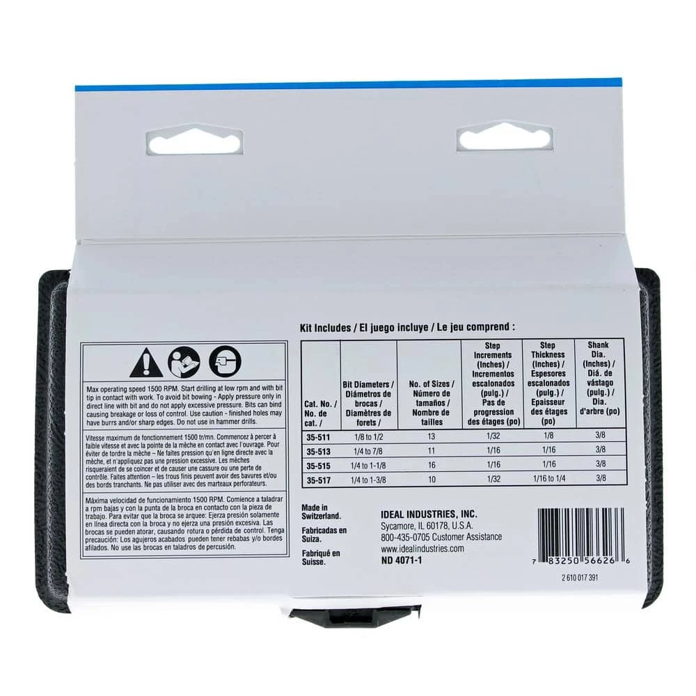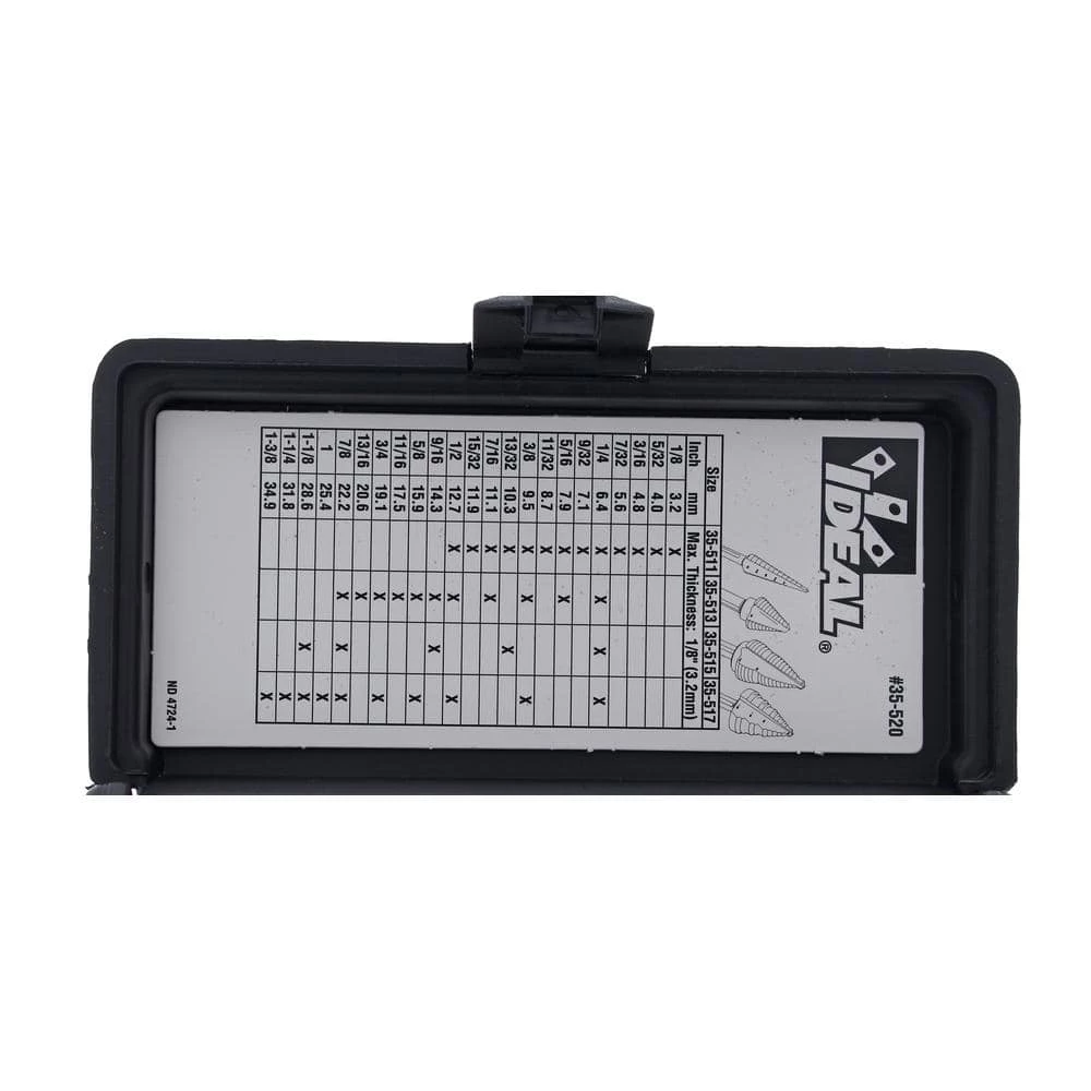 - Kit includes four step bits (35-511, 35-513, 35-515, and 35-517)