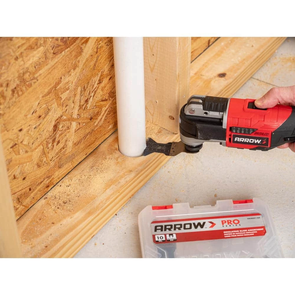 The Arrow oscillating blade kit (10 pack) is the perfect solution for any DIYers or seasoned contractors who need replacement blades for their Dremel or other oscillating multi-tools. Arrow oscillating blades are designed with a universal fit for use on most major brands of oscillating multi-tools. Arrow oscillating blade kit – 10 pack comes with a variety of blades that provide coverage for multiple cutting applications, including wood and nails, fast-cutting wood, drywall, PVC, steel, and nonferrous metals. The bimetal blades included in the 10 pack are designed to cut nail-embedded wood and can be used on both hardwoods and softwoods. The high-speed steel blades provide extended cutting performance for fast cuts in wood and a variety of other applications. And since they’re made from military-grade steel, they are designed to last. The Arrow Oscillating Blade Kit – 10 pack includes 10 oscillating blades and a tough storage case, allowing users to store multiple blades and accessories.