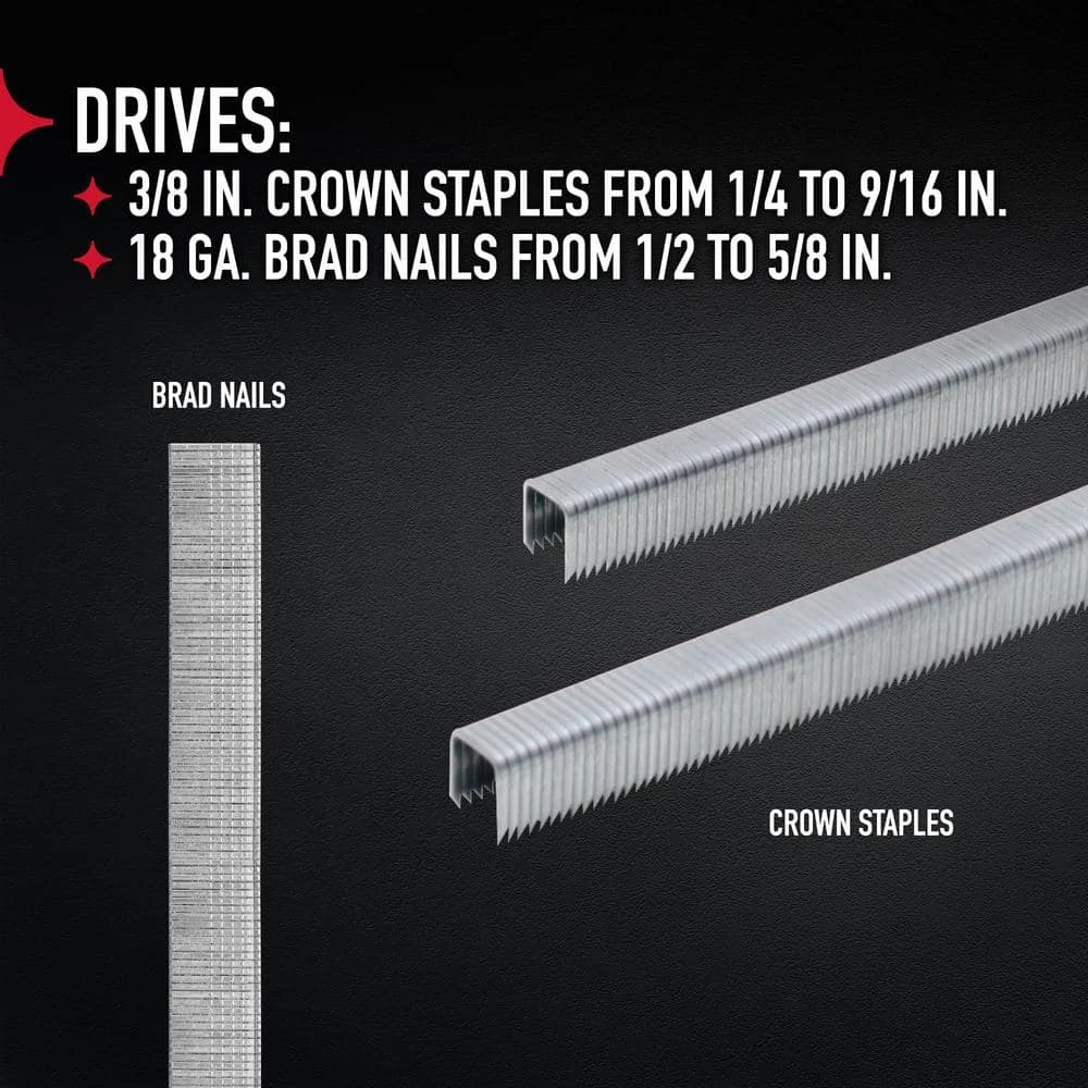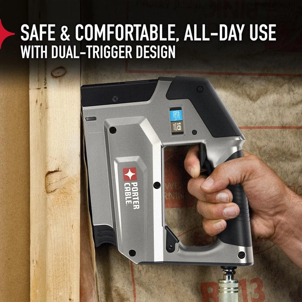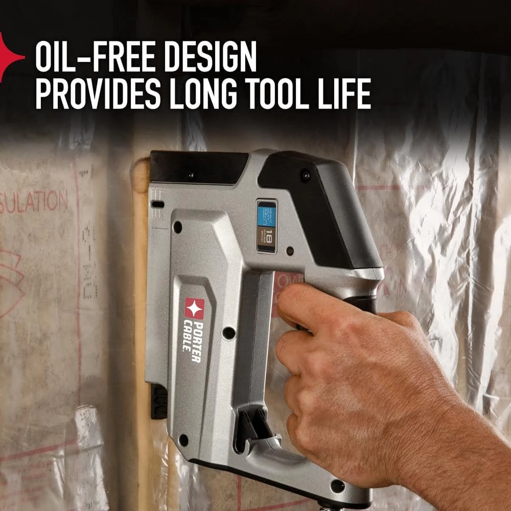The Porter-Cable TS056 is as versatile as it is tough. This tool fires both heavy-duty 3/8 in. crown staples from 1/4 in. to 9/16 in. and 18-Gauge brad nails from 1/2 in. to 5/8 in. Having this versatility allows for a wide range of fastening applications, such as insulation, vapor barrier, flooring underlayment, screening and felt paper. Oil-free operation requires no regular maintenance and eliminates the risk of oil stains.