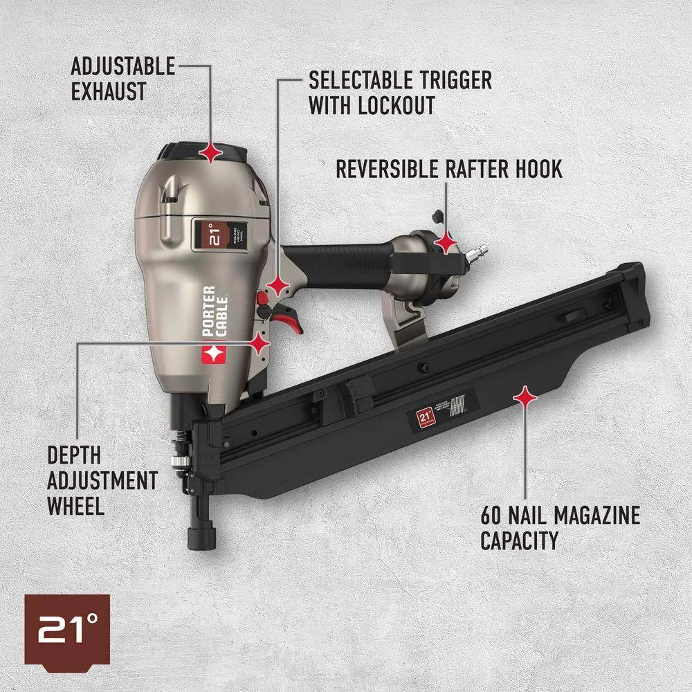 - Accepts 21° plastic round head nails from 2 in. to 3-1/2 in. (0.113 in. to 0.148 in. Dia)