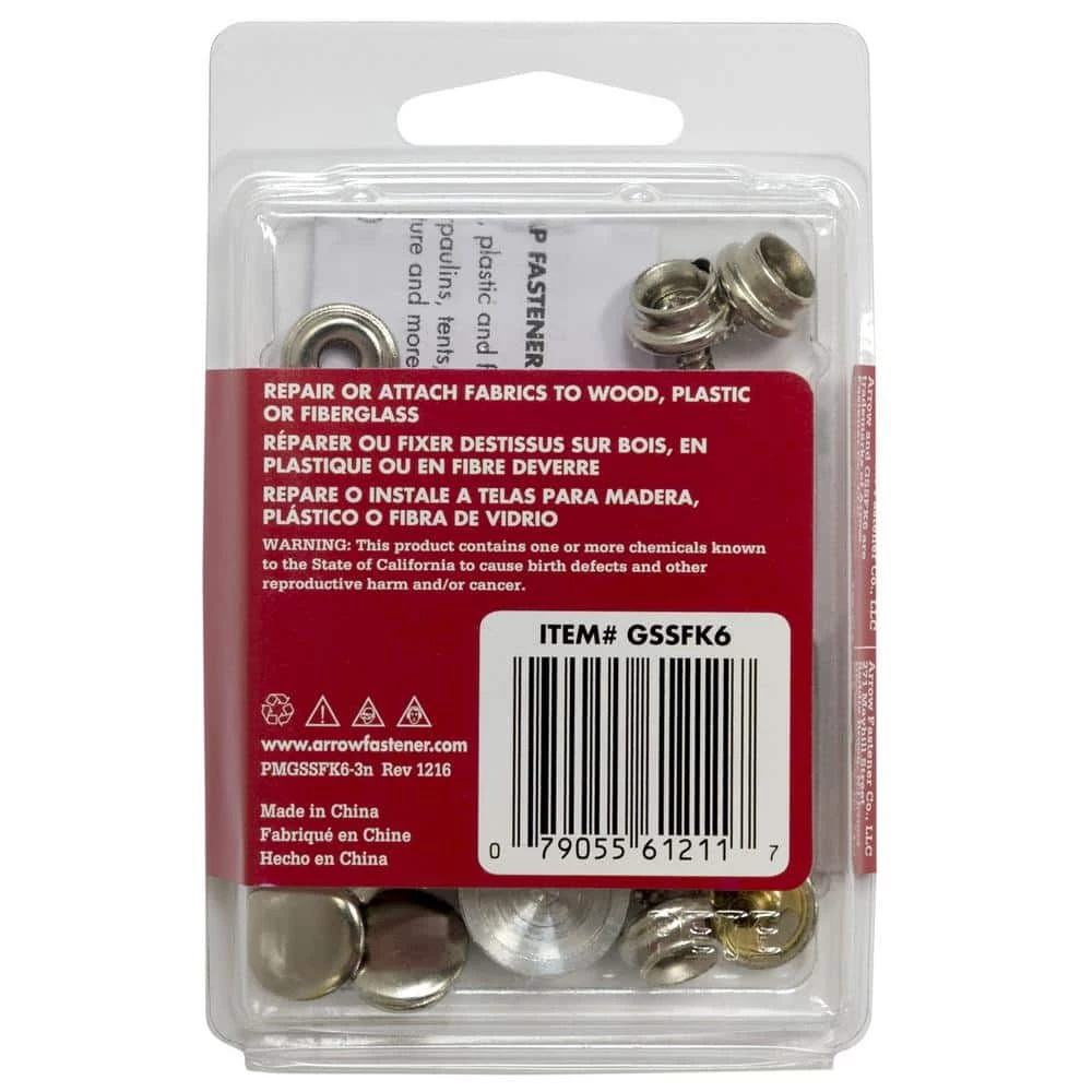 Arrows Screw Snap Fastener Kit is a handy, easy to use kit that is perfect for attaching canvas, tarpaulins, tonneau covers, sailcloth and other interior and exterior fabrics to solid surfaces such as wood, plastic and fiberglass. The button caps are nickel plated with a 3/8 in. screw. The kit contains 6-sets of screw snap fasteners and a 2-piece setting tool.