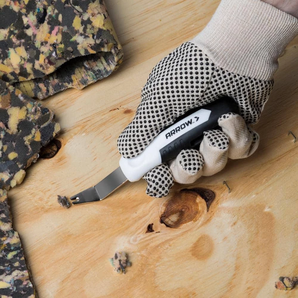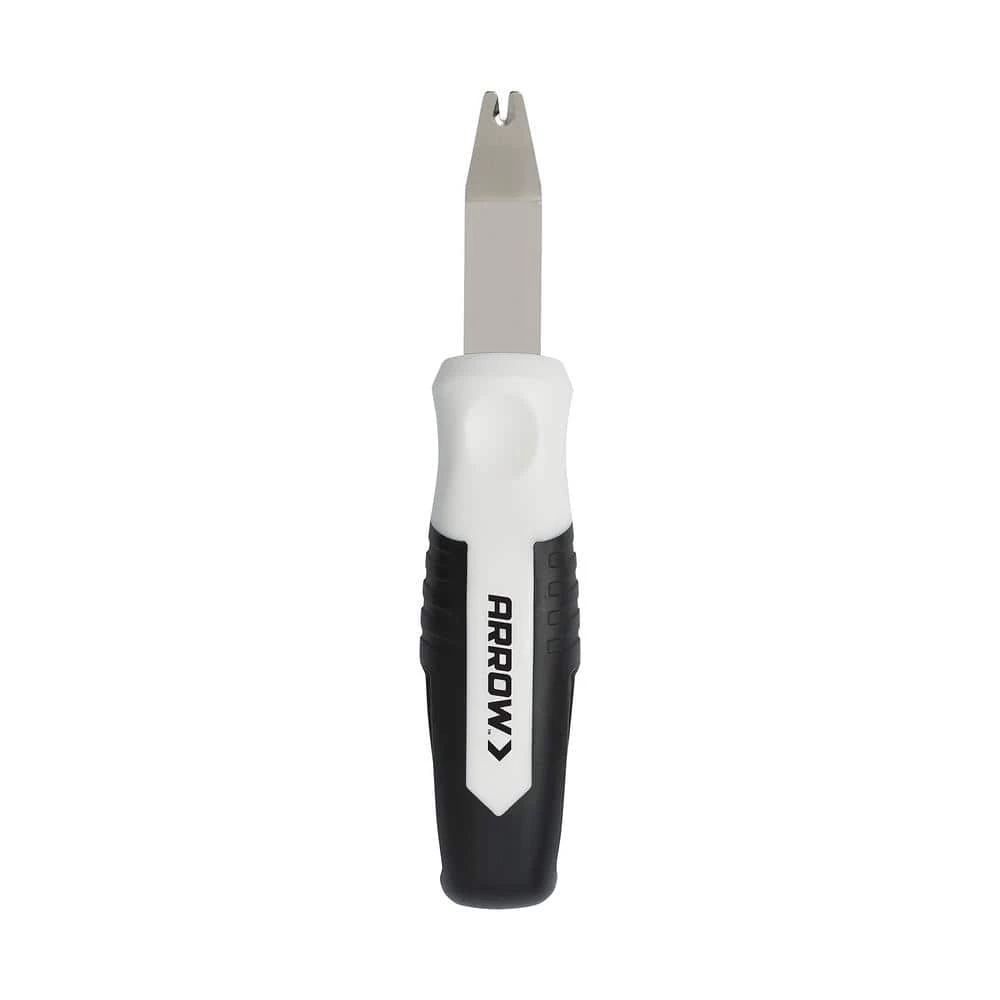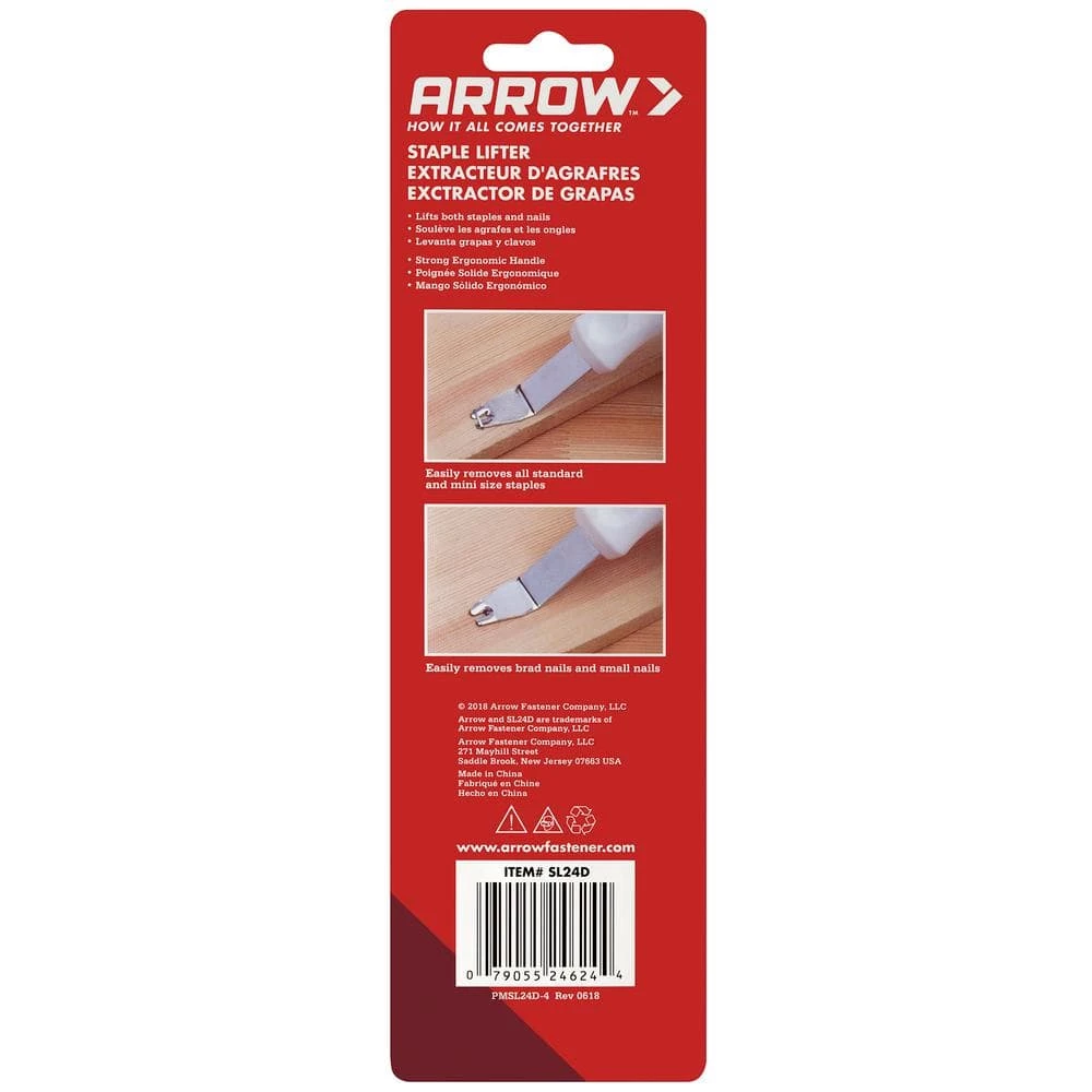 The new Arrow Staple Lifter is a handy, must-have tool for removing staples quickly, cleanly and safely. The hardened steel body stands up to even the toughest staples while the lightweight ergonomic handle provides a comfortable grip for confident handling. The angled, two prong, rounded point of the lifter makes it easy to get under staples without damaging or gouging the work surface. Perfect for upholstery and furniture refinishing projects.