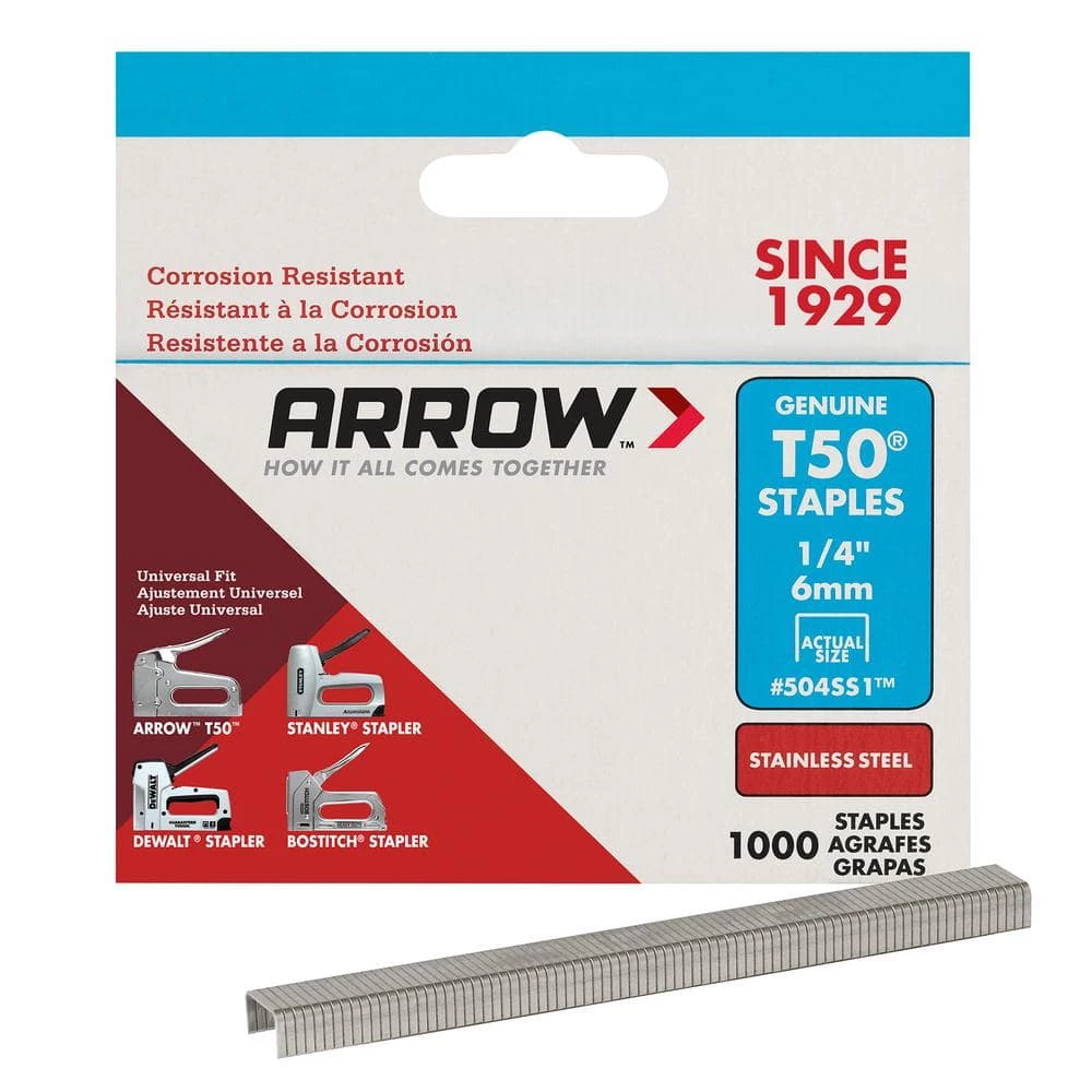 Arrow 504SS1 T50 1/4 in. (6 mm) Stainless-Steel staples are genuine Arrow Fasteners. Made of heavy duty, corrosion resistant steel, these staples will last you a long time and will hold your fabric, padding, wiring and anything else secure. A unique item on the market, the stainless-steel staples is designed to not only look nice wherever they are used but also resist the effects of tarnishing and rust. The T50 staples feature extreme versatility as they can fit many different Arrow products in addition to PowerShot, Craftsman, BLACK+DECKER, Stanley and Ace models. They can be used for light and heavy duty home projects such as installing window screening, upholstering furniture, attaching insulation and pinning down wire. Other uses include roofing felt, house wrap, weather stripping and carpeting.